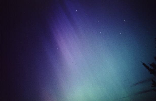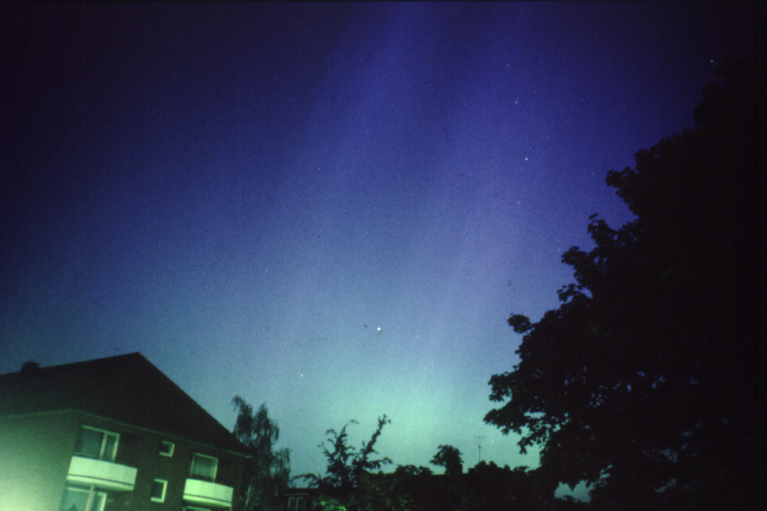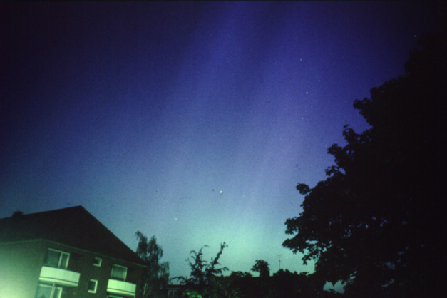 Selbst aus der lichtverseuchten Großstadt heraus war das Polarlicht gegen 2:30 Uhr noch sichtbar(20 Sekunden 3,5/28mm auf Fuji Velvia 400) |
