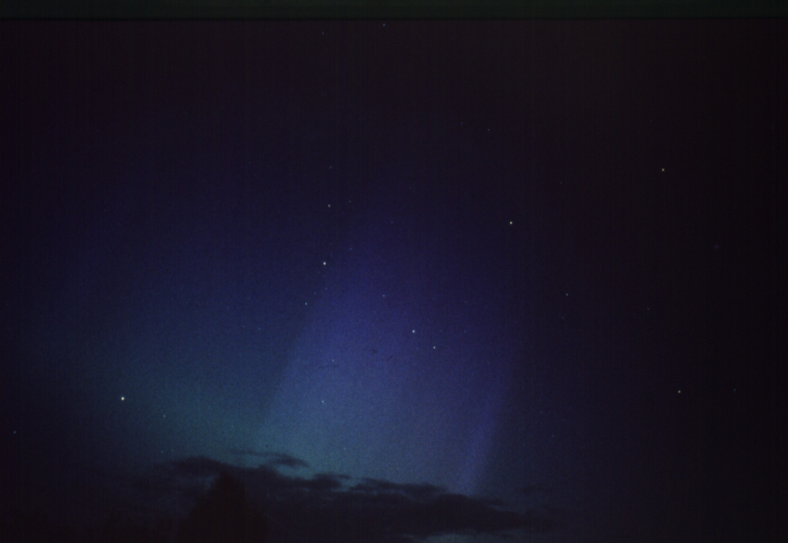 Richtung Norden grünliches Leuchten in Horizontnähe mit Streamern in Richtung Zenit (25 Sekunden 3,5/28mm auf Fuji Velvia 400) |